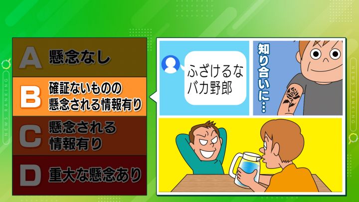 【B】の「確証ないものの懸念される情報あり」は、汚い言葉遣いをしている、友人にタトゥーを入れた人が多かった、ファミレスの水差しに口をつけようとするなどのやりすぎのイタズラなどがあったということです。