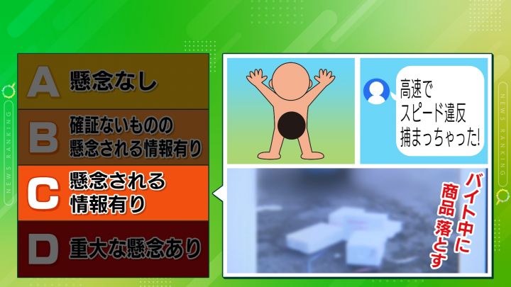 【C】の「懸念される情報あり」は、下半身を露出した写真が載せられていた、高速でスピード違反で捕まったことを自慢していた、バイト中に商品をわざと落としたと思われる写真を掲載したなどです。