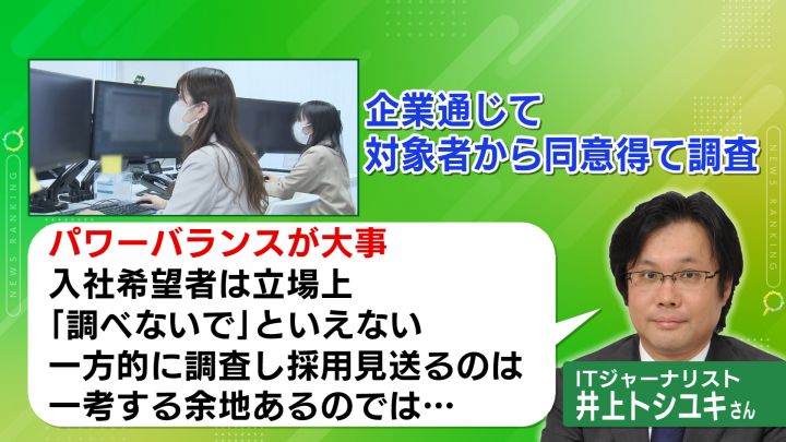 ただ井上さんは「パワーバランスが大事」と話しています。そもそも調査対象の入社希望者は、立場上「調べないでください」とはいえない状況で、一方的に調べて採用を見送るようなことは、一考の余地があるのではないかとしています。