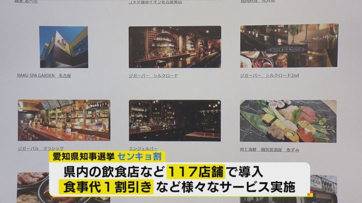 知事選で投票するとお得になる、その名も「センキョ割」。愛知県内の飲食店など117店舗が参加していて、食事代1割引きなど様々なサービスを受けられます。