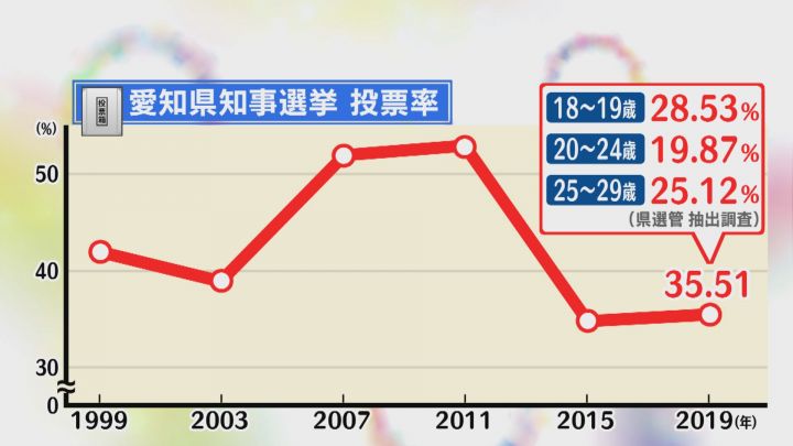 愛知県知事選の投票率は、前回の2019年が35.51パーセントと過去3番目の低さ。若い世代に限ると20〜24歳で19.87%などと全体の数字をさらに下回っていて、投票率のアップが課題となっています。
