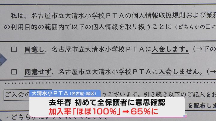 アンケートへの回答の中で最も低い加入率だったのが、名古屋市緑区の大清水小学校PTA。これまでは「ほぼ100%」の加入が続いていたが、2022年の春、全ての保護者を対象に入会意思の確認をしたところ、加入率は一気に65%に低下。「加入しなくても一切不利益はない」としたため、保護者の約3分の1がPTAに入らない判断をした。
