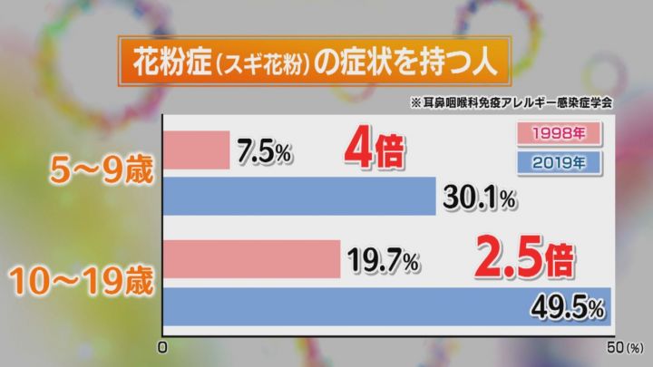 耳鼻咽喉科の学会の調査によると、5歳から9歳でスギ花粉の症状があると答えた人の割合は、1998年が7.5%だったのに対し、2019年は30.1%と20年ほどで4倍に増加。10歳から19歳でも2.5倍に増えていて、実に子供の2人に1人は「花粉症」という結果になっています。