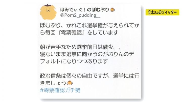 「『ゼロ票確認ガチ勢』というワードが(話題に)あがって、少しでも『選挙って面白いんだな』とか『投票に行ってみようかな』という気持ちになれば、一ガチ勢としても嬉しく思いますね。政治って堅いものじゃなくて、気軽に参加できるようなものなんだよと、そういう気持ちに若者がなってくれればいいのかなと思います」