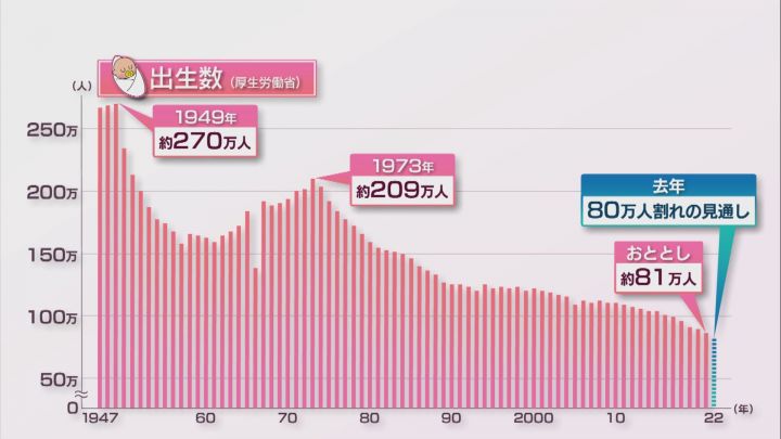 出生数はピーク時の1949年には270万人でしたが、 2022年は80万人を割り込み、過去最低となる見通しです。