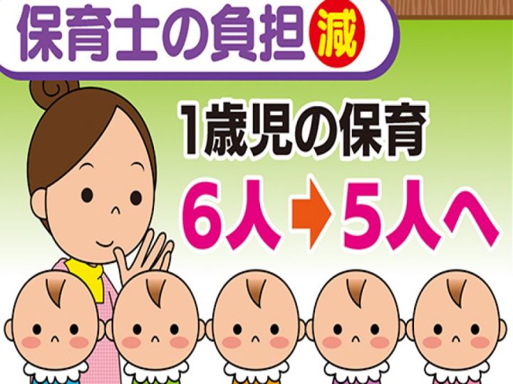 保育士の配置基準は、1歳児であれば「6人に1人」を「5人に1人」に、4・5歳児は「30人に1人」を「25人に1人」にして、負担を減らそうとする案です。