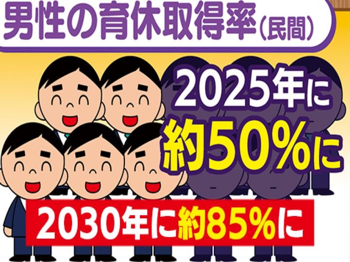 また民間でおよそ14%の男性の育休取得率を、2025年には50%、2030年に85%にすることを目標に掲げています。