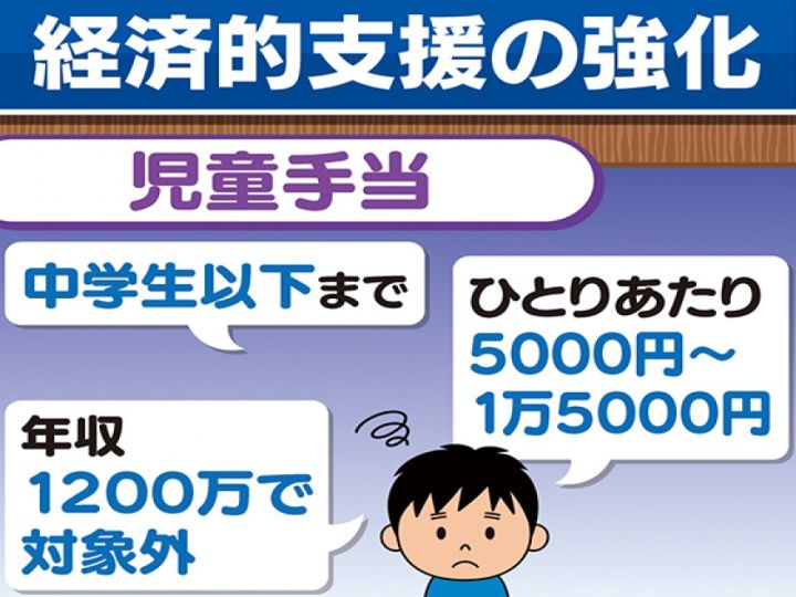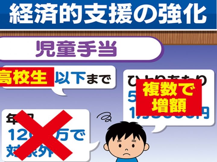 3つ目が「経済的支援の強化」です。学校給食費の無償化や奨学金の充実なども盛り込まれてはいますが、 今回は「児童手当」と「出産一時金」について注目しました。