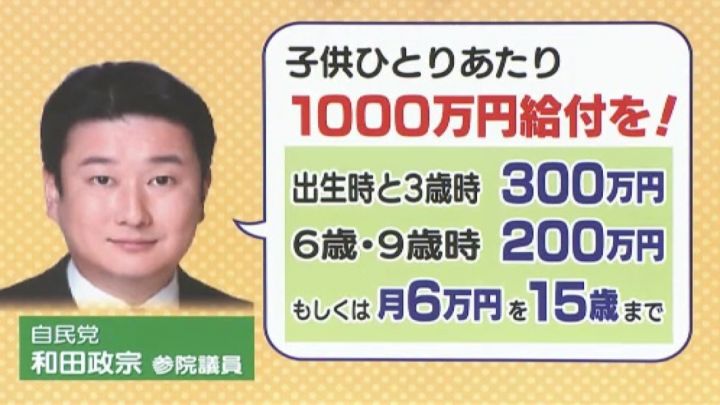 ただ、与党内でも、自民党の和田政宗(まさむね)議員が出生時の300万円をはじめ、 子供1人当たり1000万円を給付するくらいでないと現状は変わらないとも発言しています。