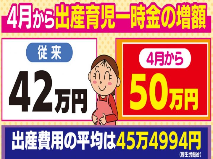 これまでの施策はたたき台とされていて、政府は具体的な案を6月にとりまとめるとしていますが、 4月から始まっているものもあります。 それが「出産育児一時金」です。 出産にあたり、原則42万円が全員に支給されていましたが、これが50万円に引き上げられました。
