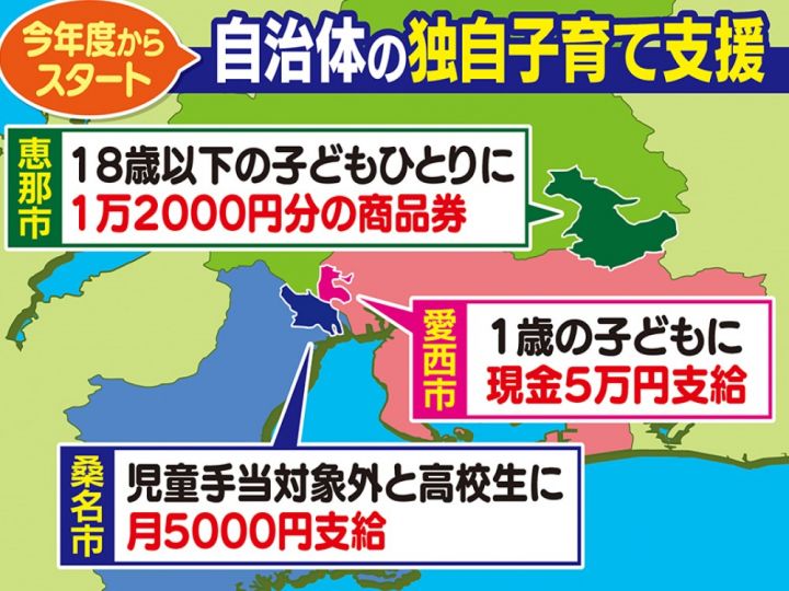 愛知県では、愛西市が1歳児に5万円、 岐阜県の恵那市では、18歳未満に1万2000円分のプレミアム商品券を贈るといった施策が始まっています。