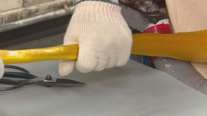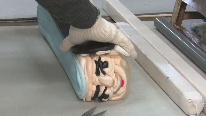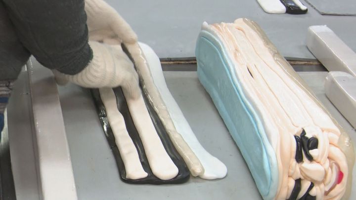 製造工程を見せてもらいました。様々な色の長い飴を組み合わせて…。