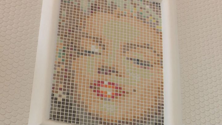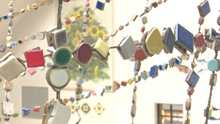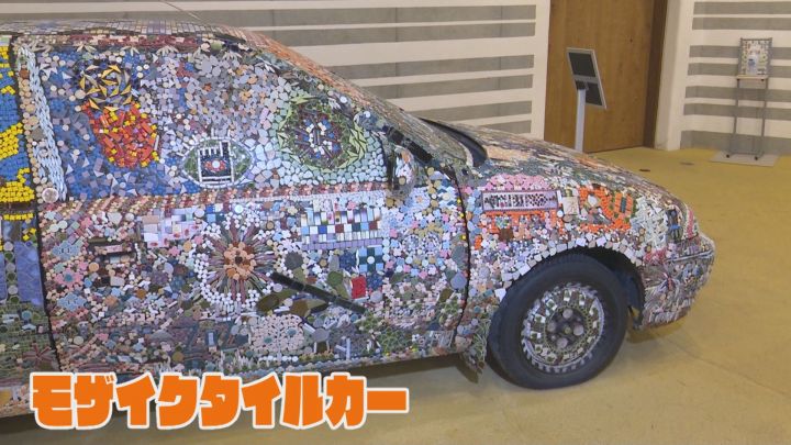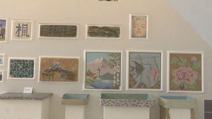 「モザイクタイル」とは、50平方センチより小さいタイルのことで、この地域が日本一の産地です。展示室には、天井までモザイクタイルびっしり。