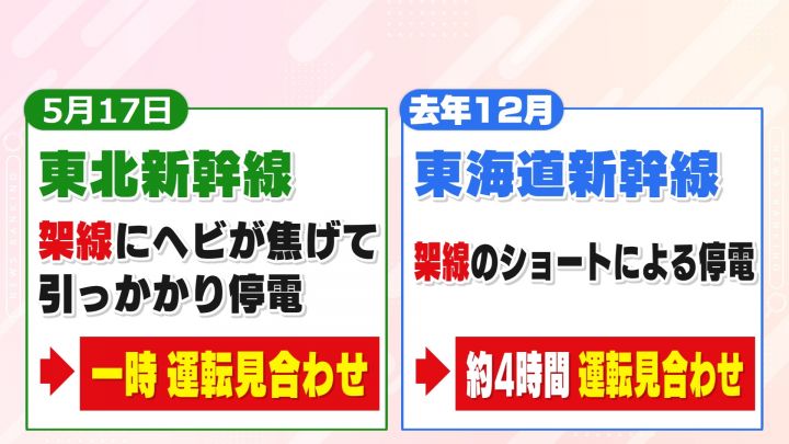 架線に関するトラブルはしばしば発生しています。5月17日には東北新幹線で、架線にヘビが焦げて引っかかった影響で停電が発生し、一時運転を見合わせました。