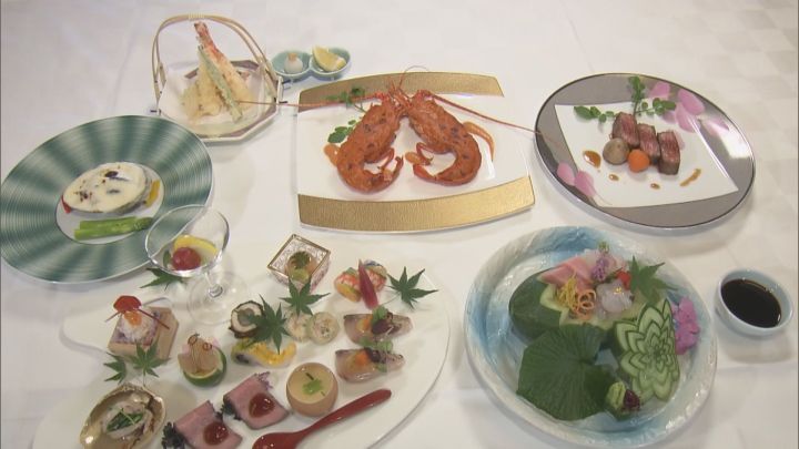 伊勢エビや伊勢マグロのお造りに、卵の殻を器がわりにした茶碗蒸しなど、見た目も美しい59種類の料理が提供されました。
