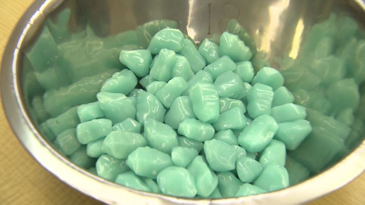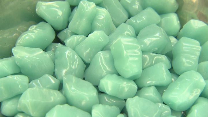 その考えの通り、きれいなエメラルドグリーンの防犯砂利ができた。色むらがないのはもちろん、アクリル板を使ったことで、表面に光沢感まで出すことができた。