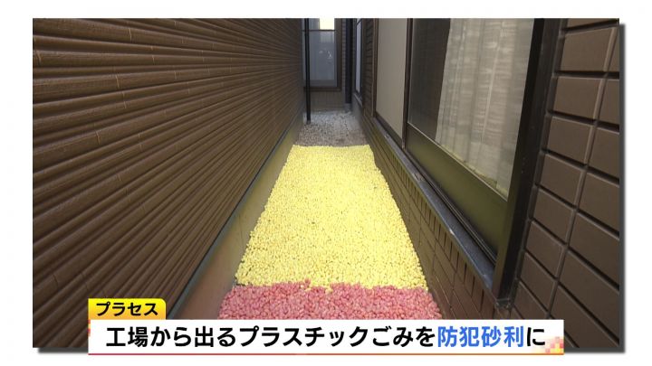 プラセスでは、工場から出るプラスチックごみからカラフルな「防犯砂利」を作っている。