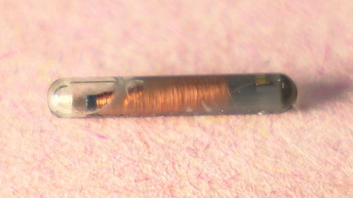 直径約1ミリ、長さ1センチほどのチップを、専用の注入器を使って皮膚の下に埋め込む。