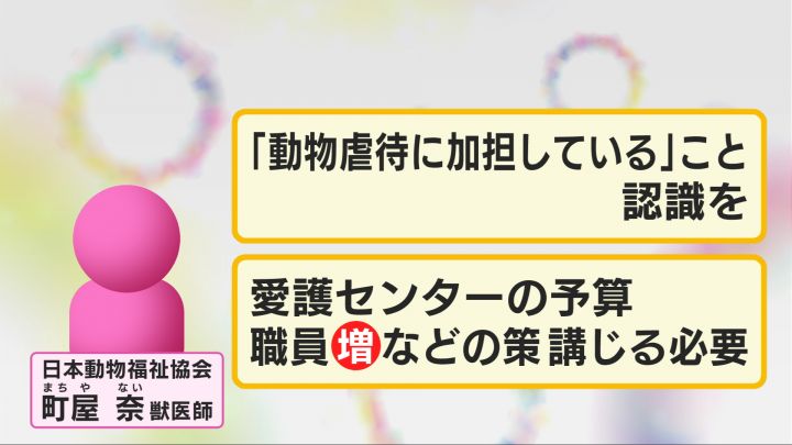 「(愛知県内の)別のところにも劣悪な業者がいて。今の時点で私が言えることは、(法改正は)あまり意味がない。不幸な子たちを救うためにやらなきゃいけないことは“マイクロチップ”じゃない。動物が“モノ”ってなっている。この国の動物に対する在り方。“モノ”じゃないよっていうところをまず変えていただいて、そこからだと思うんです」