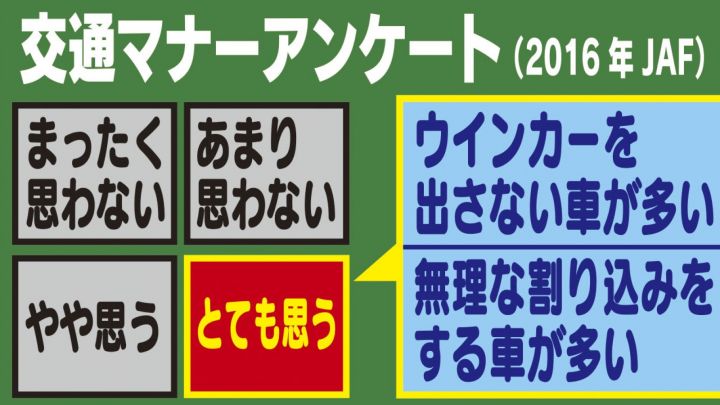 JAFが2016年に行った交通マナーのアンケートでは「まったく思わない」「あまり思わない」「やや思う」「とても思う」の4段階の回答で「ウインカーを出さない車が多い」という質問について「とても思う」と答えたのは、全国平均の29.4%に対し愛知県は32.7%、ワーストは岡山県の53.2%でした。