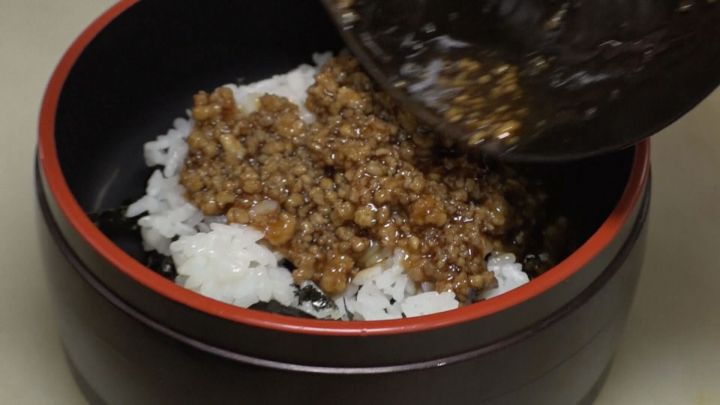 ご飯の上に、甘辛く味付けしたそぼろと海苔を層にして重ね…。