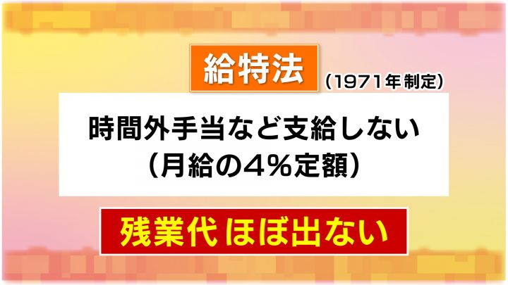 教師の長時間労働の背景には、長年変わらない法律の影響もある。いまから50年ほど前の1971年に制定された「給特法」という法律だ。公立学校の教職員の給与に関する法律で、時間外勤務や休日勤務の手当を支給しない代わりに月給の4%を支払うというものだ。つまり「残業代がほぼ出ない」ということになる。