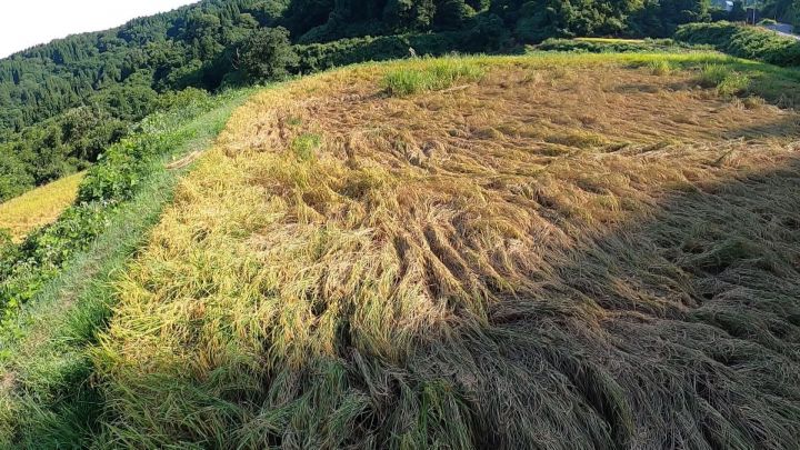 一面に広がる稲のほとんどが枯れた状態で倒れています。