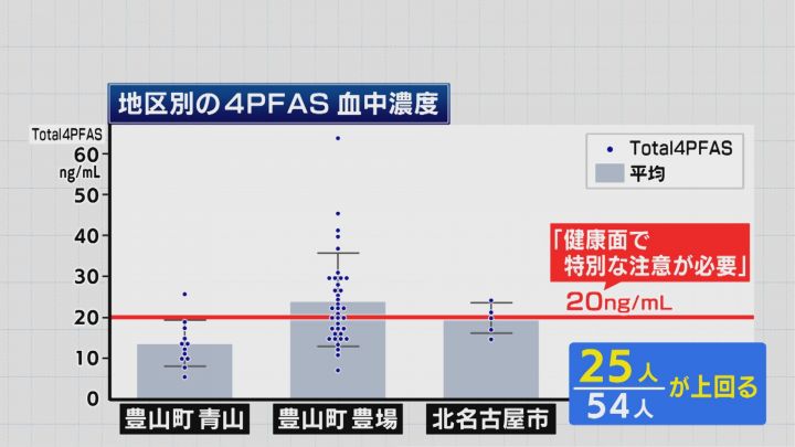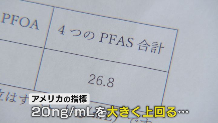 PFAS4種類の合計で、アメリカで「健康面で特別な注意が必要とされる指標」の血中濃度が20ng(ナノグラム)/mLを半数近くの25人が上回る結果だった。最も高い人では、3倍以上にもなる。