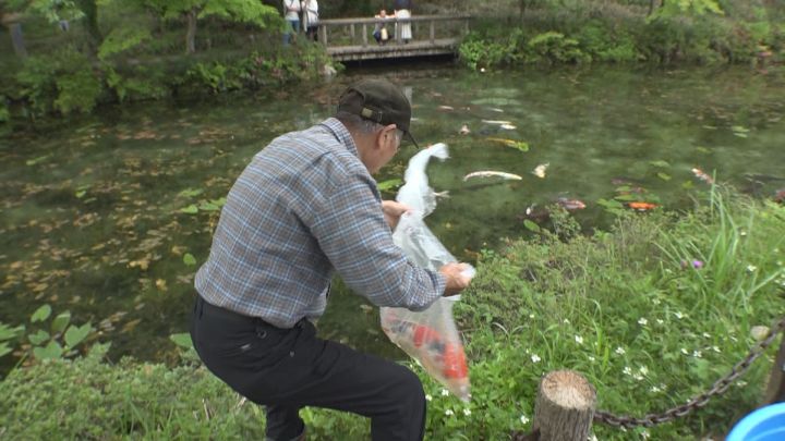 「趣味で飼っていたんですけど、年齢的にもう卒業する年になりましたので。どこにやろうかなと思った時に、ここの池が一番ふさわしいかなと思って持ってきたんです。どこかの品評会にも出ても通るような鯉ばっかりだと思うんですが、何万匹育った中のエリートが今ここにいるんですけど」