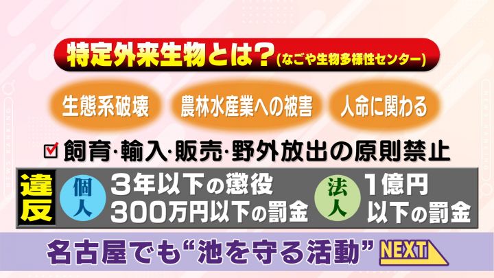 天白区の「なごや生物多様性センター」によりますと、特定外来生物には「生態系を壊す」「農林水産業への被害」「人の命に係わる」といった恐れがあるものが指定されています。