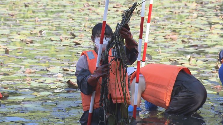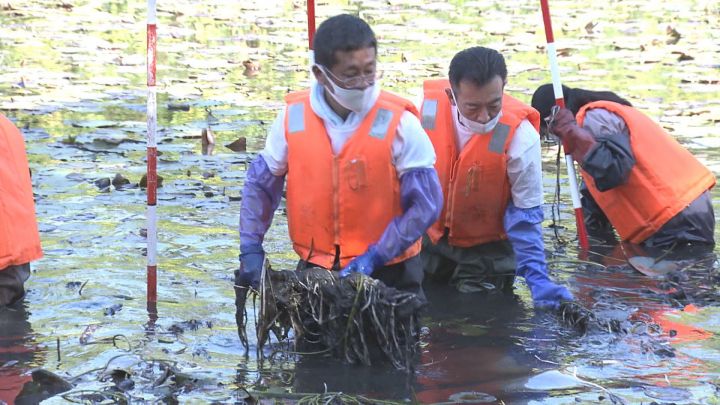 千種区の東山新池では2022年11月、池を覆う「スイレン」を抜く「池のスイレン全部抜く作戦」が行われました。
