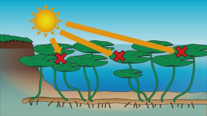 きれいな花を咲かせるスイレンですが実は外来種で、成長が早いのが特徴です。放置すると茎や葉が池全体を覆ってしまい、他の植物が光合成できずに水中の酸素が減少し、在来種が死ぬこともあります。
