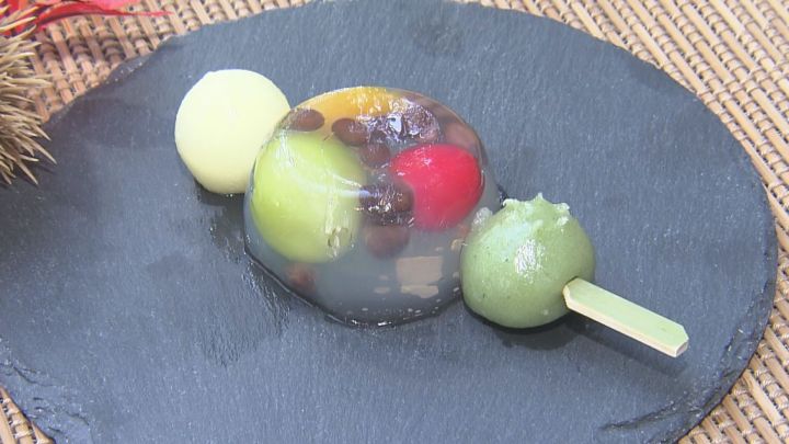 コラボしたスイーツは他にもあります。あんみつと団子が“ドッキング”した商品「お月見あんみつだんご」は、あんみつの具材を寒天で固めてあり、黒蜜をかけて食べます。