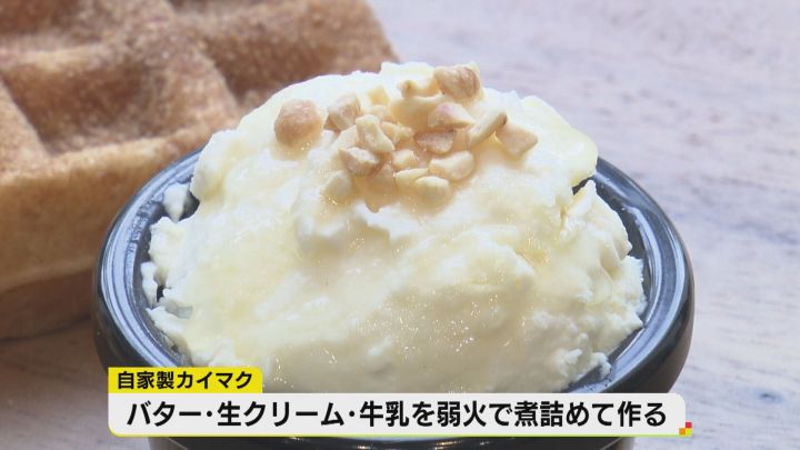 この店のカイマクは、バターと生クリーム、牛乳を合わせ、軽い口当たりのクリームに仕上げています。クロッフルやクルンジに付けて食べるとおいしいということです。