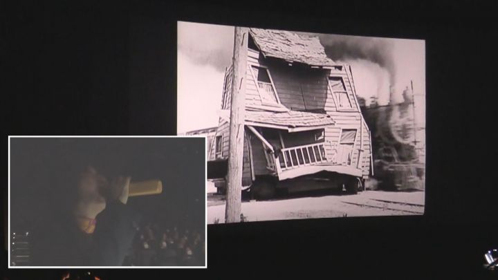楽士で名古屋市出身の柳下美恵(やなした・みえ)さんは、ピアノ演奏だけでなく列車の汽笛も楽器を使って表現します。コミカルな表現に、映画館は笑いに包まれました。