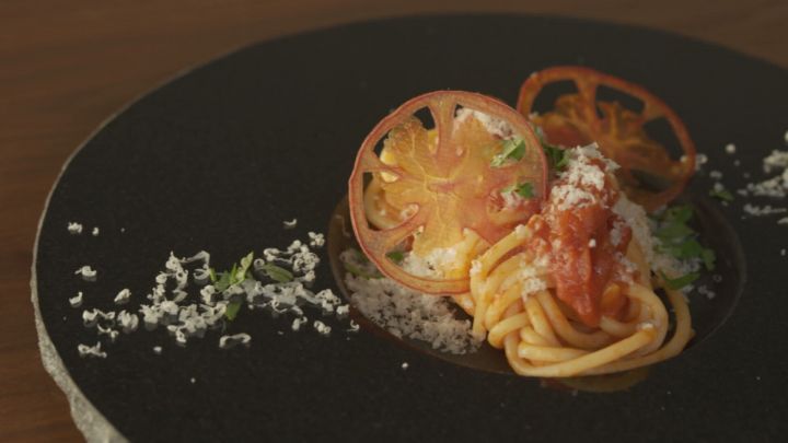 赤いトマトソースのパスタが映える、漆黒の食器。墓石に使われている石と同じ石材を使って作られています。御影石や大理石といった高級石材をオシャレに加工し、様々な用途に合わせて考案しています。