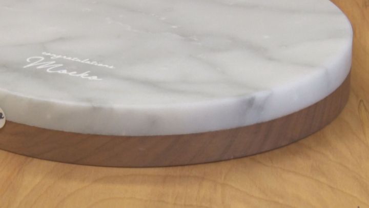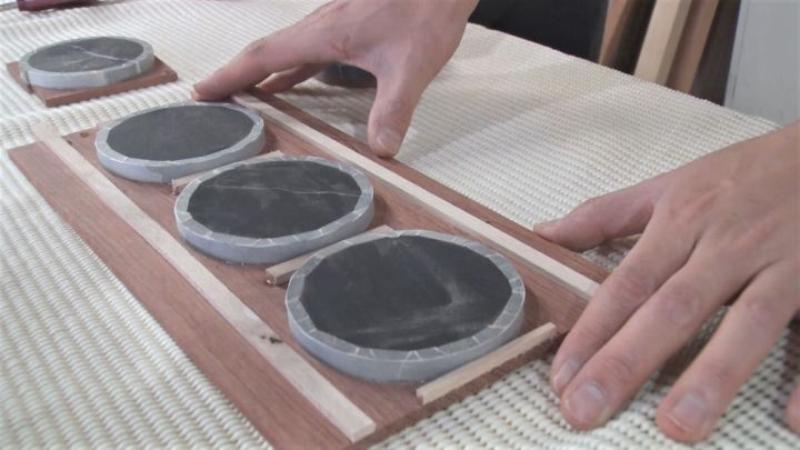 八田さんのところの木工職人の知恵も借りて試行錯誤し、特殊な接着剤で丸い形にした石と加工前の木を張り合わせた後に、石の形に合わせて木を削り出す方法で、つなぎ目の部分に段差のないプレートが実現しました。