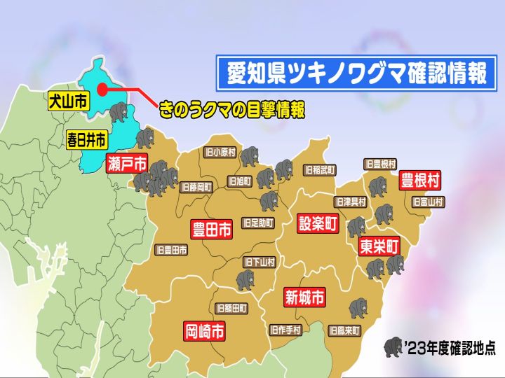 2023年11月13日、犬山市の入鹿池で目撃されましたが、11月9日には入鹿池の現場から5キロほど離れた春日井市内でも、クマとみられる足跡を県職員が確認しています。尾張北部の山間部でも注意が必要です。