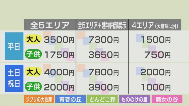 入場できるエリアの数別に3種類。最も充実しているジブリパークの全5エリア+「ハウルの城」などの建物内部も楽しめるチケットは、平日料金で大人7300円・子供3650円です。