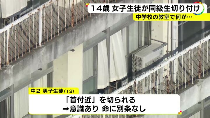 警察が出動して確認したところ、中学2年の男子生徒(13)が、同級生の女子生徒(14)にナイフで切りつけられたことがわかりました。男子生徒は左の首のあたりを切られ救急搬送されましたが、意識はあり、命に別条はありませんでした。