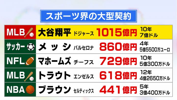 10年で1015億円の大谷選手は、1年単位で計算するとメッシ選手が上回りますが、世界のスポーツ界全体で最高の契約額となりました。