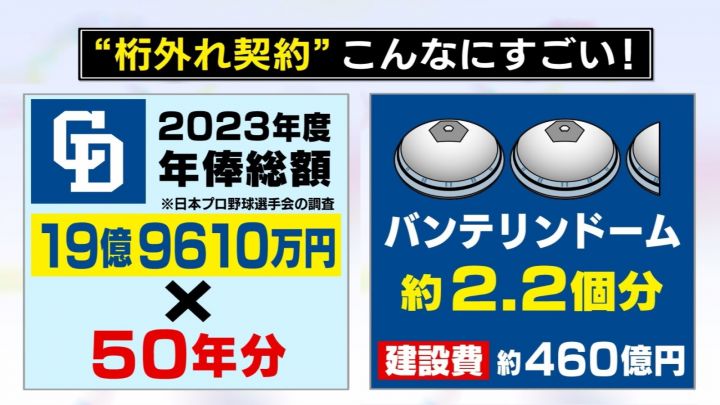 日本のプロ野球でみると、中日ドラゴンズの2023年度の年俸の合計は約20億円で、その50年分に相当します。