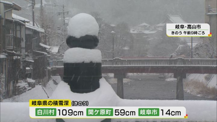 最強寒波が到来した24日、岐阜県白川村で最大109cm、岐阜市でも最大14cmの積雪を記録しました。