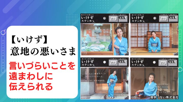 意地の悪いさまを表す「いけず」は、「言いづらいことを遠まわしに伝える」表現で、ステッカーでは、日常の“あるある”なシーンを舞台に、本音と建前が表現されています。