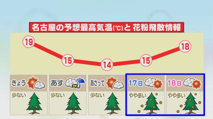 東海3県では今後も気温が高い日が続く見込みで、ウェザーニュースによりますと、15日は雨の予報ですが、雨の次の日に気温が高くなると花粉が飛びやすくなることもあり、週末は花粉の飛散が「やや多い」予想となっています。