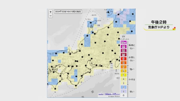 2月は、紫外線が強くなり始め、実際14日の東海3県では、紫外線が中程度降り注いだことを示す黄色になっていました。花粉とダブルで肌に影響を与える恐れがあります。