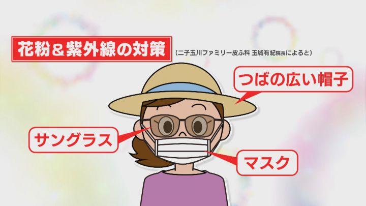 医師によりますと、つばの広い帽子やサングラス、マスクなどを着用して肌を守ることが、花粉と紫外線の両方に効果的だということです。