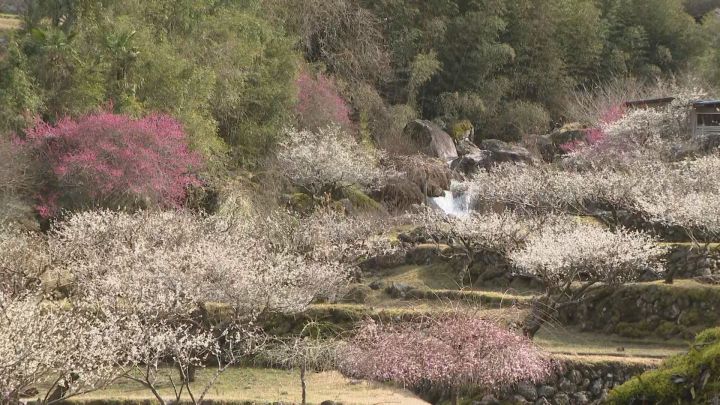 新城市では2月として観測史上最高の22.7度を記録し、川売地区ではおよそ1500本植えられた梅が5分咲きで、見ごろを迎えつつあります。