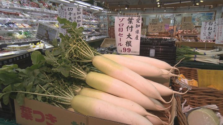 名古屋市中川区のスーパーで、太くて大きい立派な大根が税込みで107円など、値ごろな野菜が並んでいました。