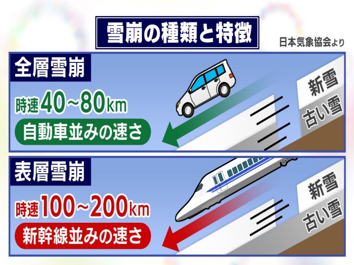 これに対して全層雪崩は、元々あった雪と積もった雪が一緒に滑り落ちる雪崩で、表層雪崩のほうが速度は速いです。